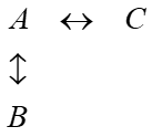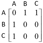 \begin{align} \rightarrow\quad \begin{array}{cc} \;\;\begin{array}{ccc}A&B& C \end{array} \\ \begin{array}{c}A\\ B\\ C \end{array}\left[\begin{array}{lll} 0 & 1 & 1 \\ 1 & 0 & 0 \\ 1 & 0 & 0 \end{array}\right]& \begin{array}{c} A \leftrightarrow C=1\\ A\leftrightarrow B=1 \end{array} \end{array} \end{align} |