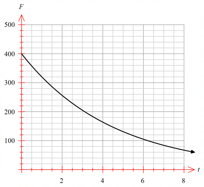The size of a flock of birds, \(F\), after \(t\) years is declining exponentially by the function \(F=400 \times(0.8)^t\), as seen in the graph.