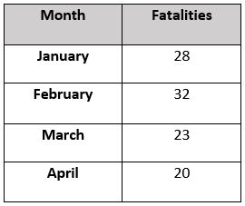 The adjacent table shows the number of fatalities in the first 4 months of 2020 on NSW roads.