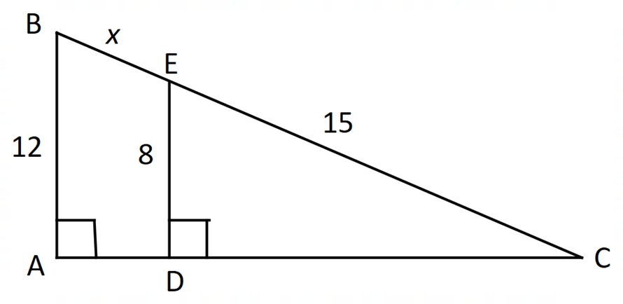 In \(\Delta DEC:\,ED=8,\,EC=15,\, \angle EDA=90^\circ,\,BE=x\). Find \(x\)